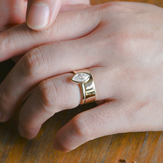 Solid Gold Bezel Marquise Cut Moissanite Engagement Ring with 6MM Width Cigar Wedding Band, Bridal Set