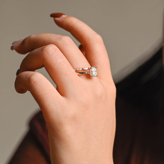 Solid Gold Elongated Cushion Cut Moissanite Engagement Ring and Wedding Ring Set