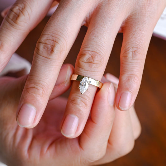 CausYou Solid Gold D/VS1 Off-Center Marquise Cut Lab Grown Diamond Ring, Cigar Band Wedding Ring