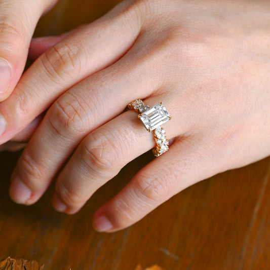 Solid Gold Hidden Halo Emerald Cut Moissanite Engagement Ring
