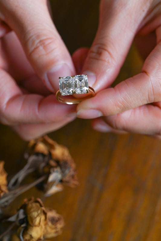 Solid Gold Emerald Cut Moissanite Toi et Moi Ring