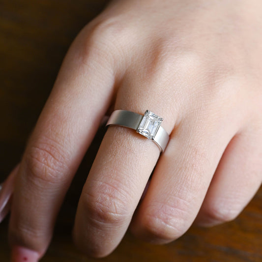 Solid Gold 5mm Width Matt Emerald Cut Moissanite Engagement Ring, Solitaire Promise Ring