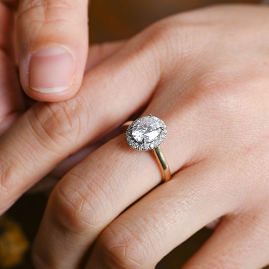 Solid Gold Halo Oval Cut Moissanite Engagement Ring, 2.5mm Width Cathral Setting Promise Ring
