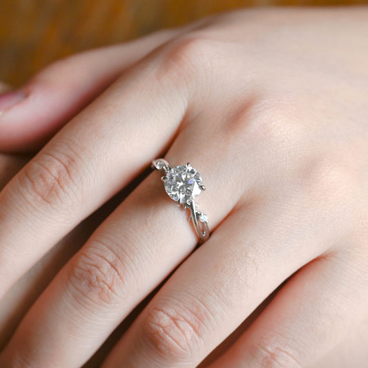 Solid Gold Twist Band Round Cut Moissanite Ring, Leaf Wedding Ring