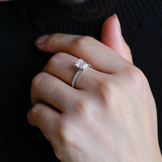 Solid Gold Emerald Cut Moissanite Engagement Ring with Hidden Halo