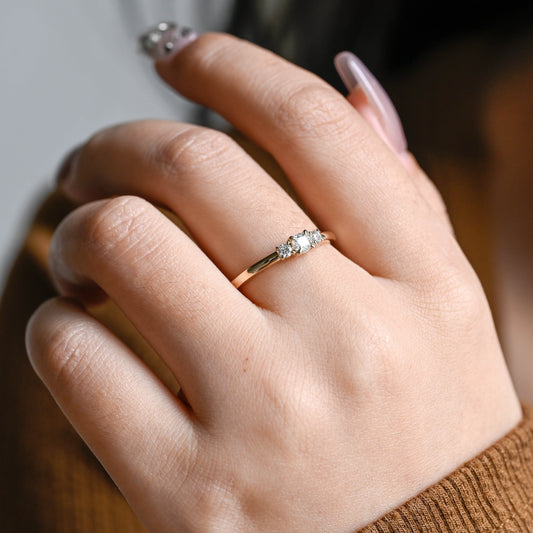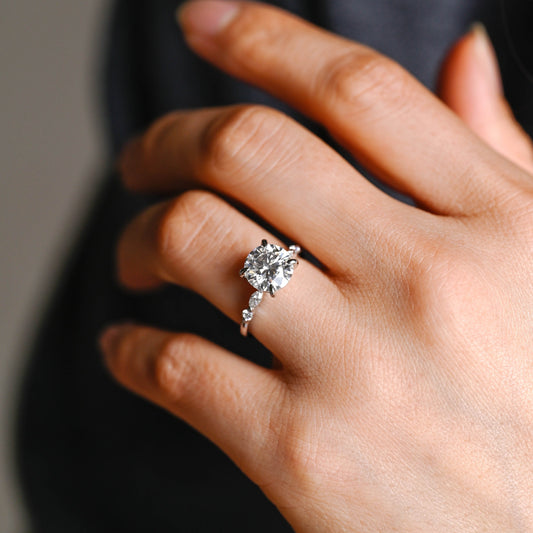 Solid Gold Round Moissanite Engagement Ring, Side Marquise Ring