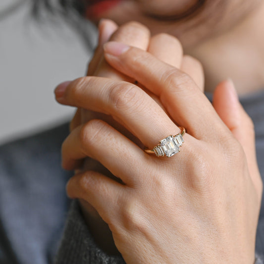 Solid Gold Emerald Cut Moissanite Engagement Ring, Three Stone Promise Ring, Proposal Ring