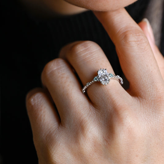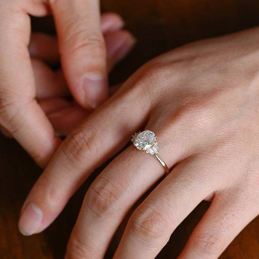 Solid Gold Side Cluster Crushed Ice Oval Cut Moissanite Engagement Ring