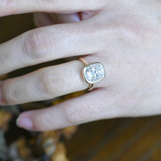 Solid Gold Bezel Elongated Cushion Cut Moissanite Engagement Ring