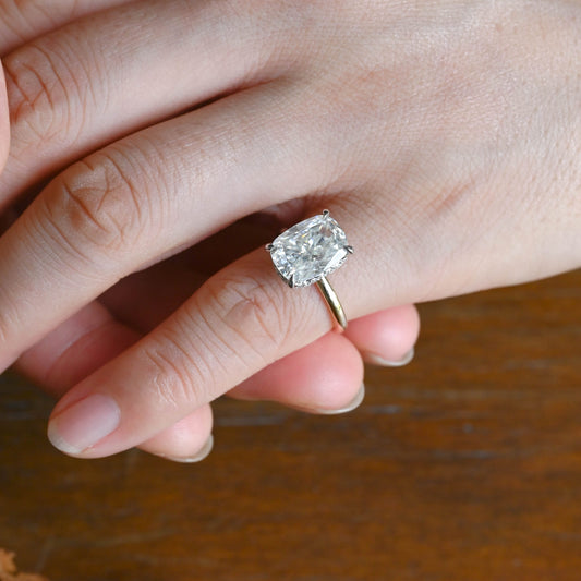 Solid Gold Hidden Halo Crushed Ice Elongated Cushion Cut Moissanite Engagement Ring