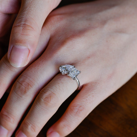 Solid Gold Toi et Moi Ring, Pear & Emerald Cut Moissanite Engagement Ring