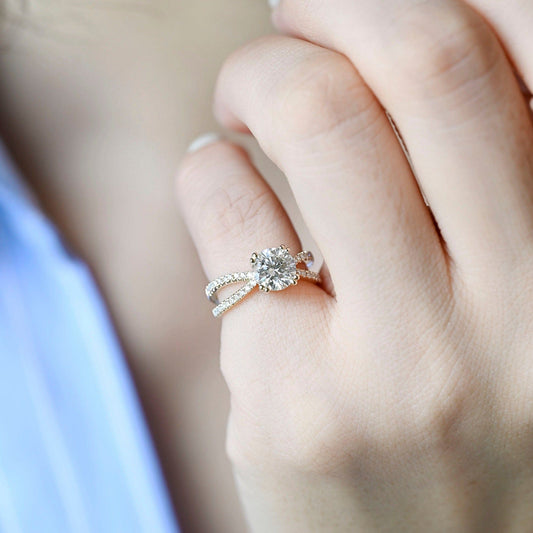 Solid Gold Round Cut Moissanite Engagement Ring, Split Shank Ring