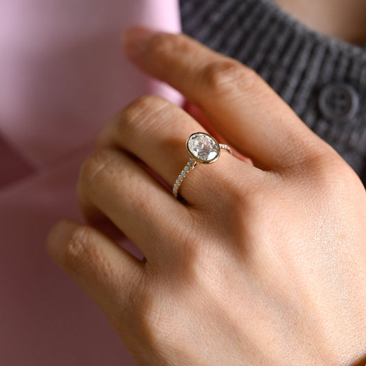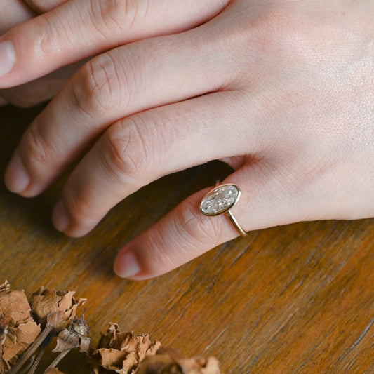 Solid Gold Bezel Crushed Ice Elongated Oval Cut Moissanite Engagement Ring