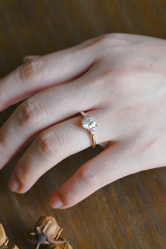 Solid Gold Pink Lab Sapphire Side Cluster Oval Cut Moissanite Engagement Ring