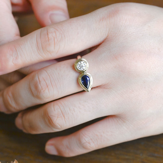 Solid Gold Toi Et Moi Ring, Pear Cut Blue Lab Sapphire & Round Cut Moissanite Engagement Ring