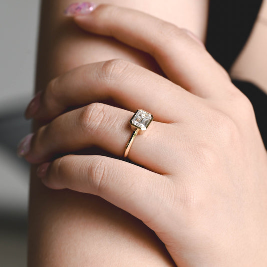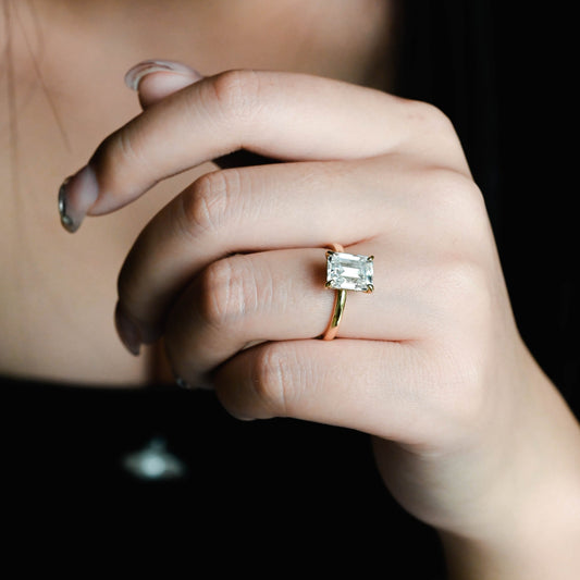 CausYou Solid Gold D/VS1 Bezel Lab Grown Emerald Cut Diamond Engagement Ring, East West Set Wedding Ring