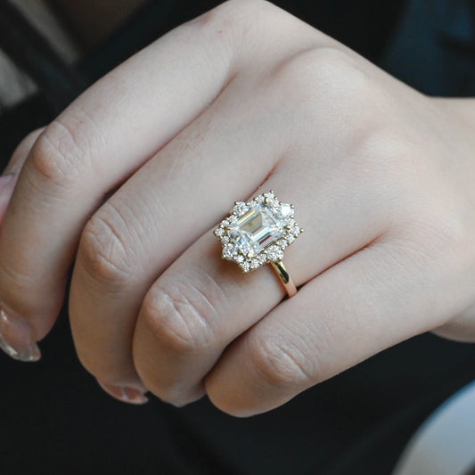 CausYou Solid Gold D/VS1 Low Setting Halo Pave Emerald Cut Lab Grown Diamond Engagement Ring