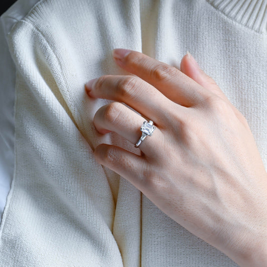 CausYou Solid Gold D/VS1 Emerald Cut Lab Grown Diamond Engagement Ring, Baguette Accents Wedding Ring