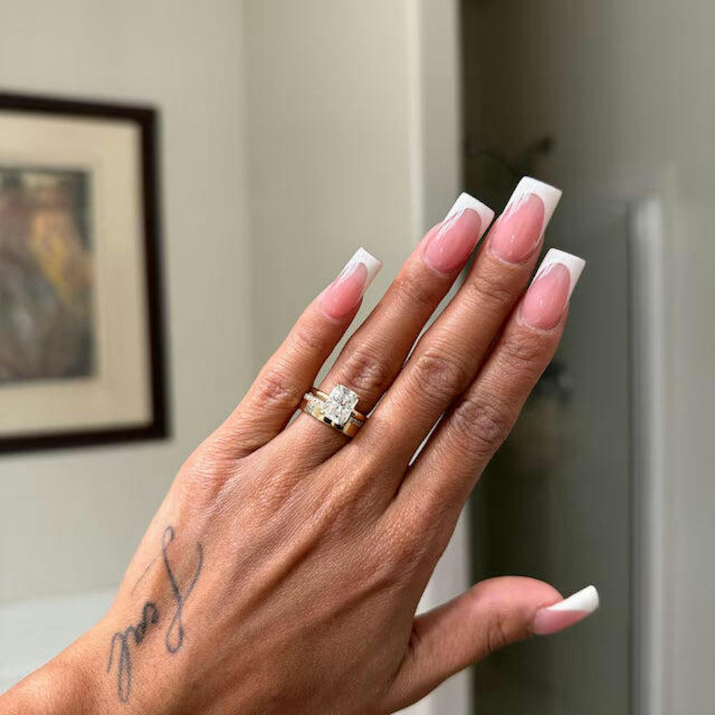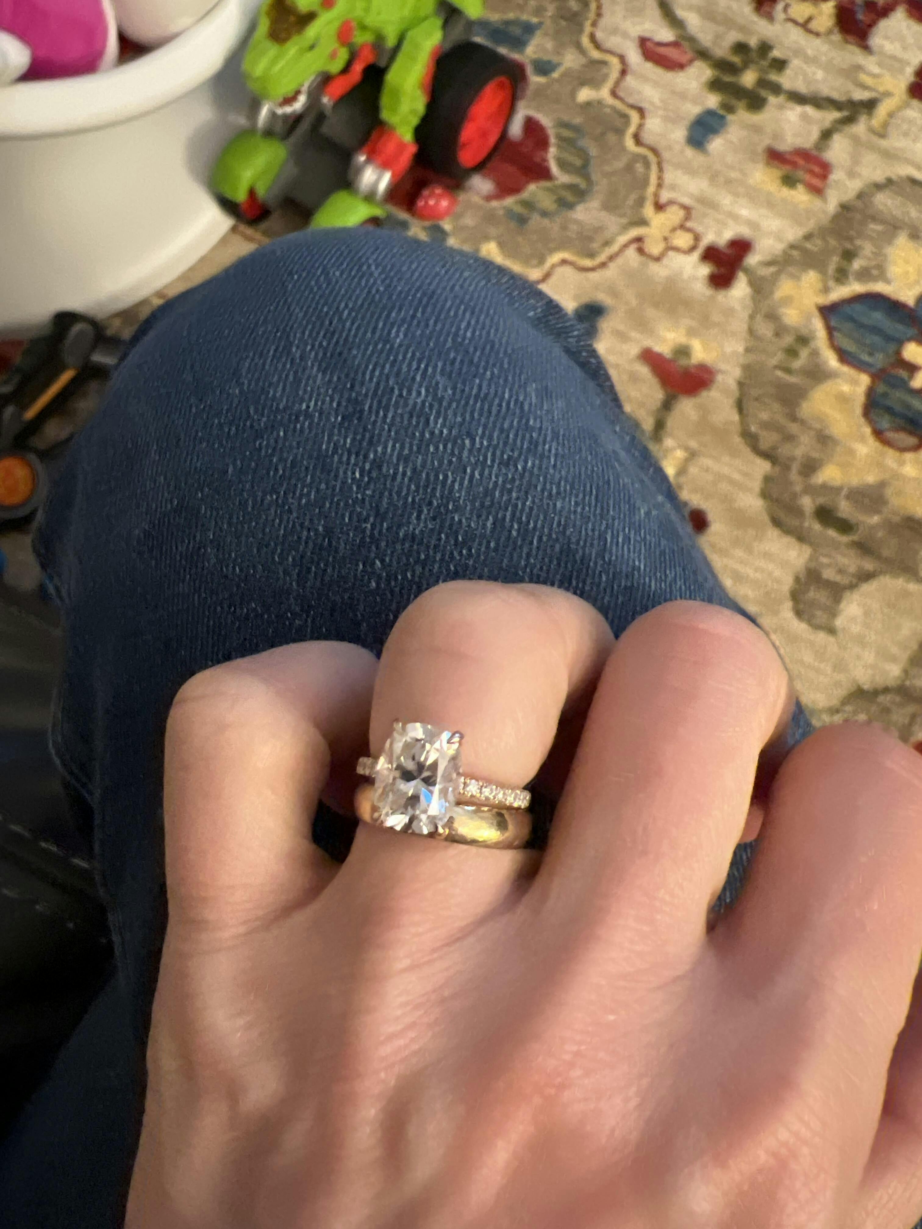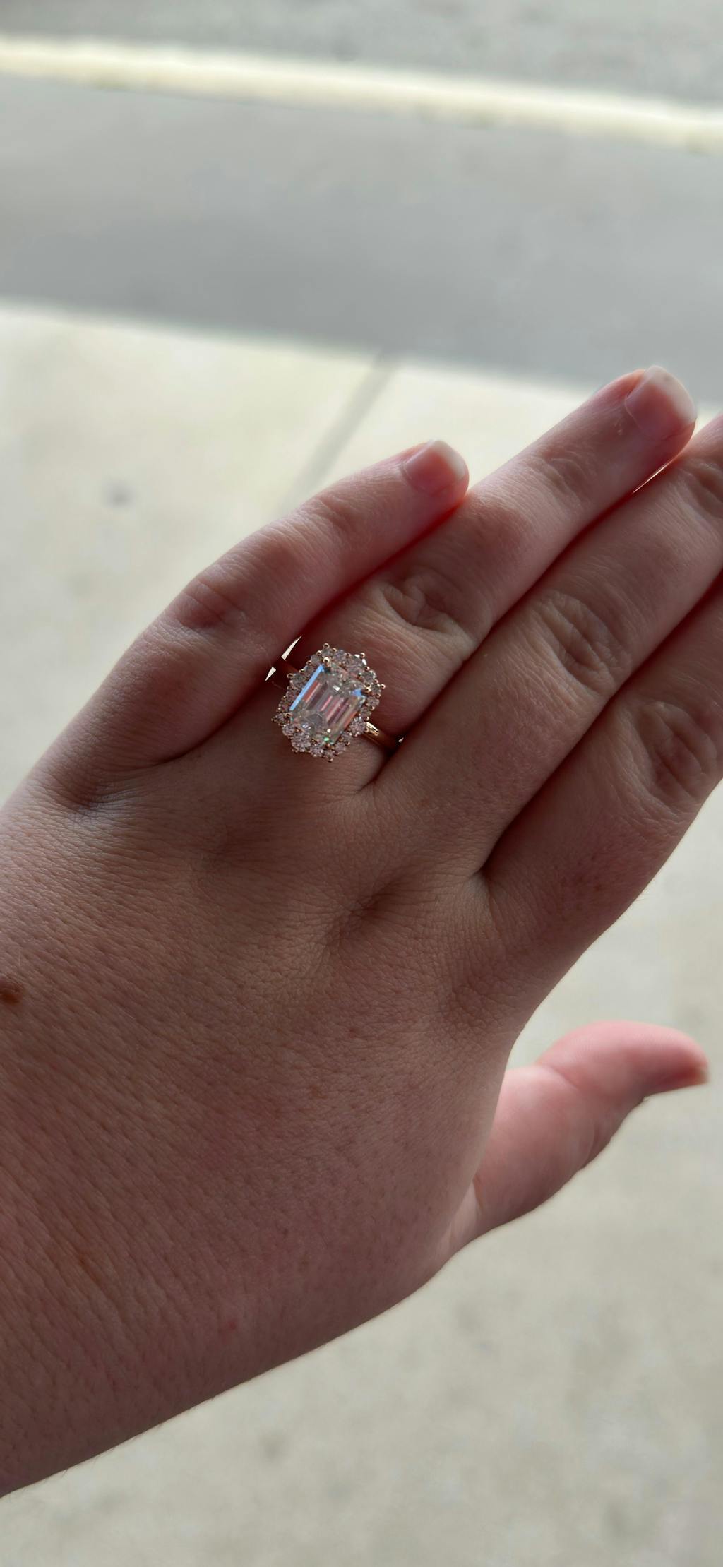 I’m so obsessed with my ring! I just love the plain basket halo setting.. so elegant, beautiful and timeless, love the sparkle, will definitely be deciding on your moissanite wedding band options in the near future! My ring is a 2ct, on 10k yellow gold, ring size 8 for reference! I can’t stop looking at my hand.. she’s just breathtaking!