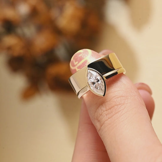 Solid Gold Bezel Marquise Cut Moissanite Engagement Ring with 6MM Width Cigar Wedding Band, Bridal Set